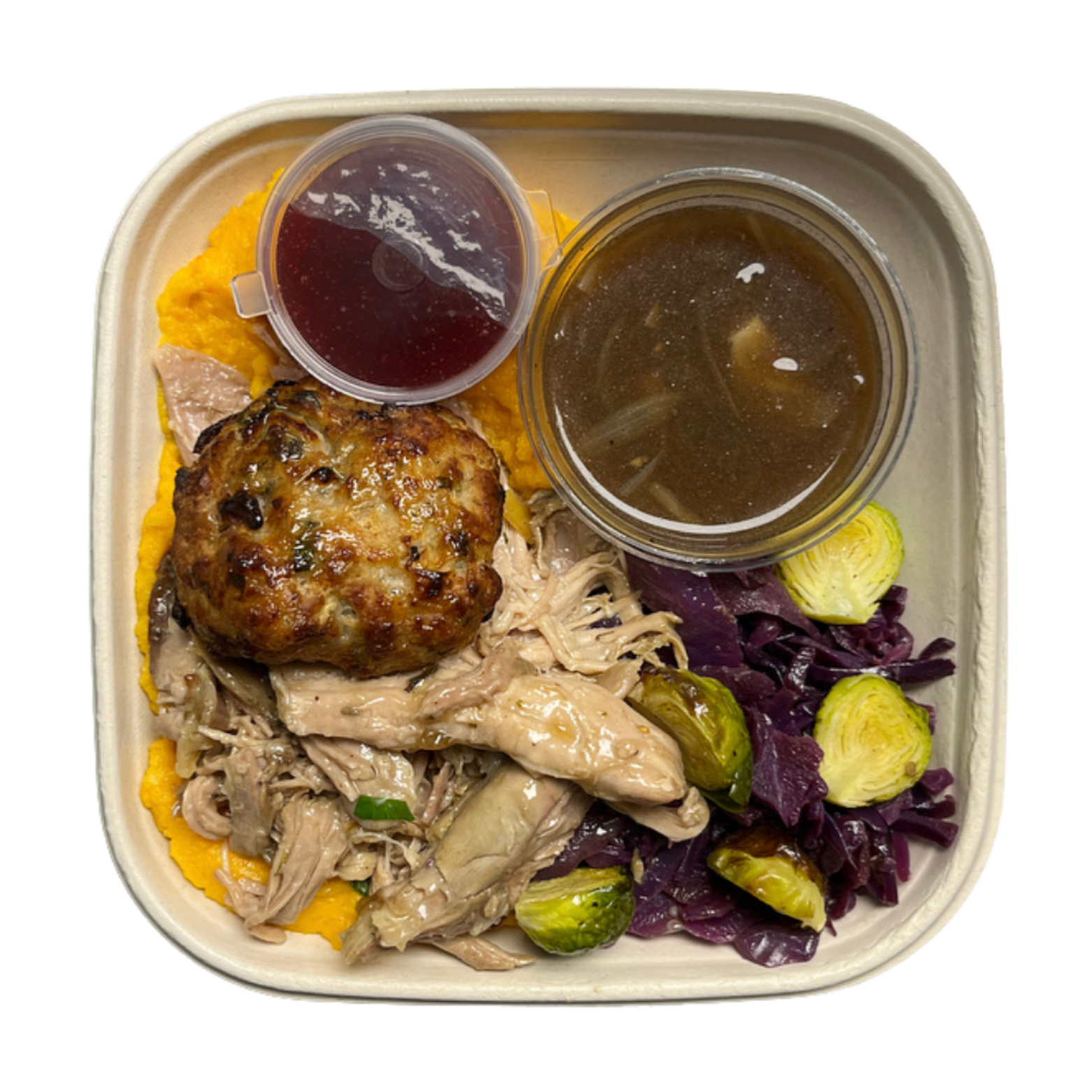 Slow roasted pulled turkey thigh. Served with pork & sage stuffing, carrot & swede mash, braised red cabbage, sprouts, onion gravy & cranberry sauce.
