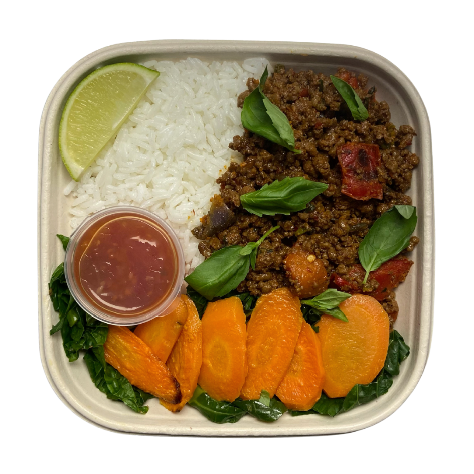 Lean beef mince cooked with Thai herbs and spices served with sticky jasmine rice, roasted carrots, and spring greens